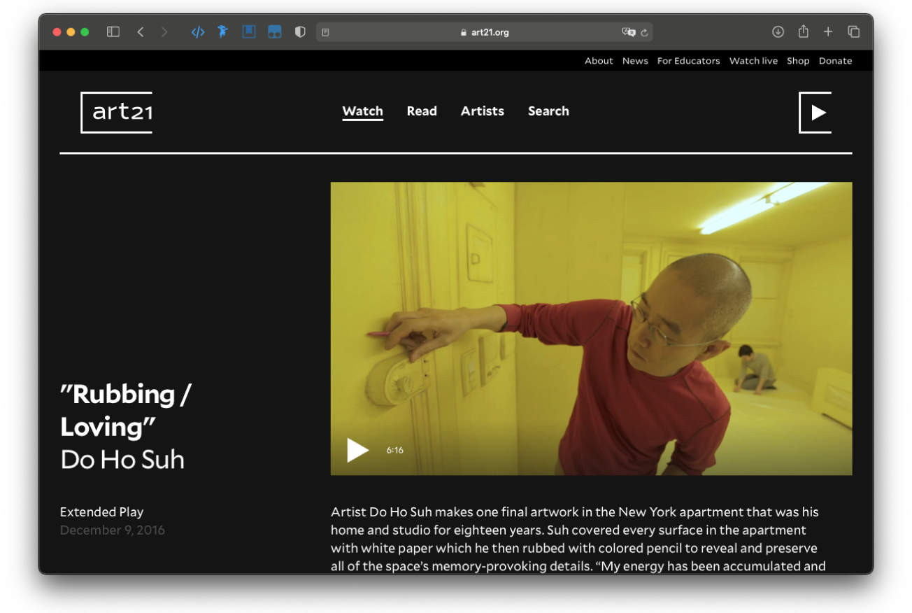 Мне кажется, я уже писал о сериале Art21, посвящённом современному визуальному искусству и художникам. Но по поиску в рассылке ничего не нашёл. И это странно, ведь смотрю его уже давно, по чуть-чуть. Вышло десять сезонов, первые семь были посвящены различным темам: идентичность, время, место, юмор и так далее, и авторам, работающим с этими понятиями. Начиная с восьмого сезона рассказывают о крупных мировых центрах современного искусства от Лондона до Йоханнесбурга.Самое интересное наблюдать за работой художников, как они превращают идеи в искусство и как борются с сомнениями.
